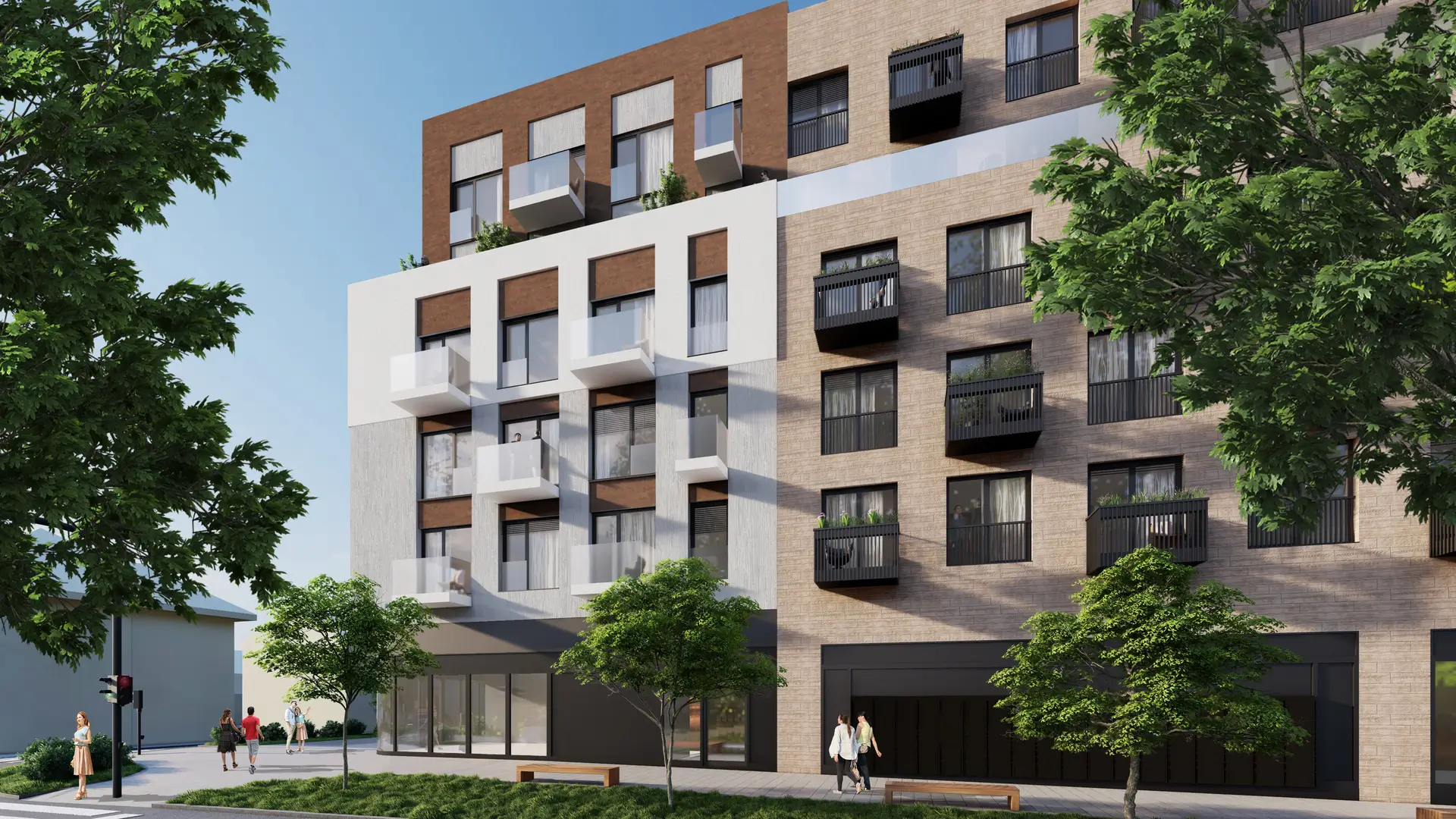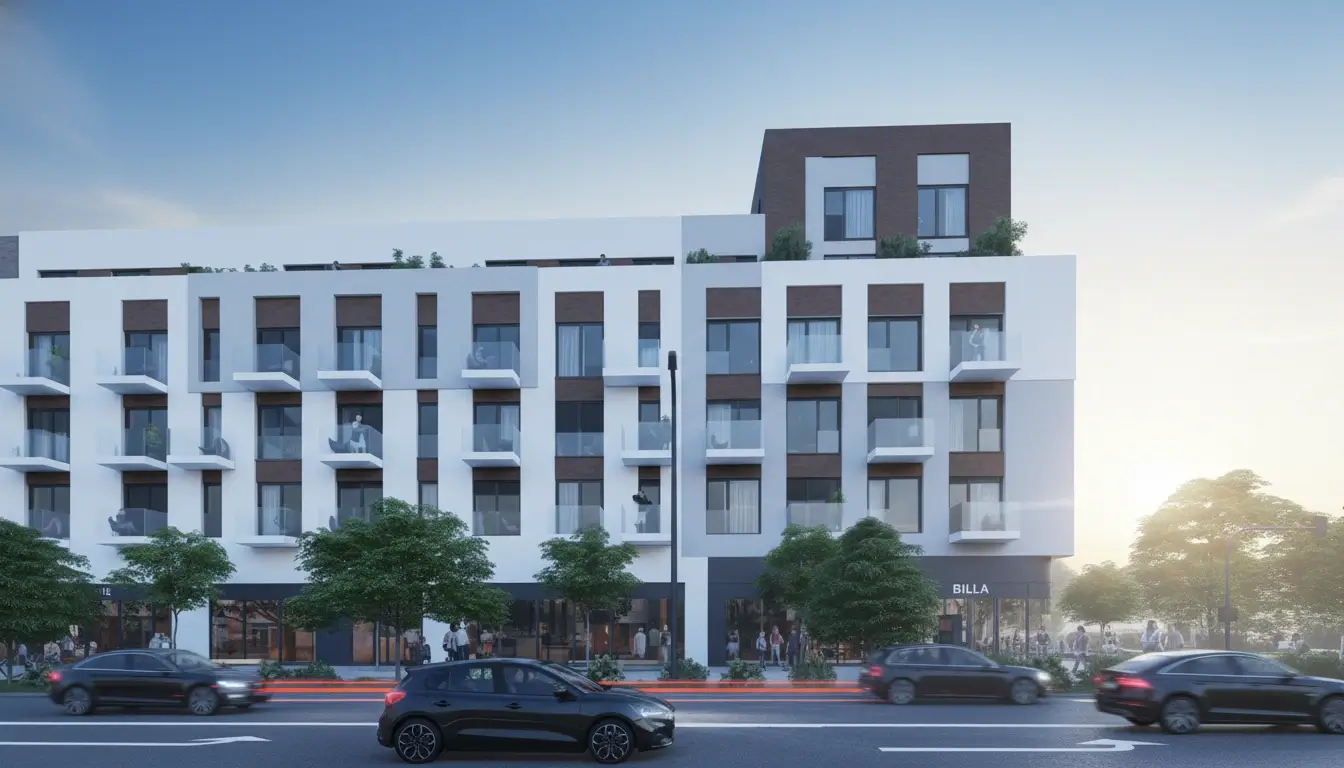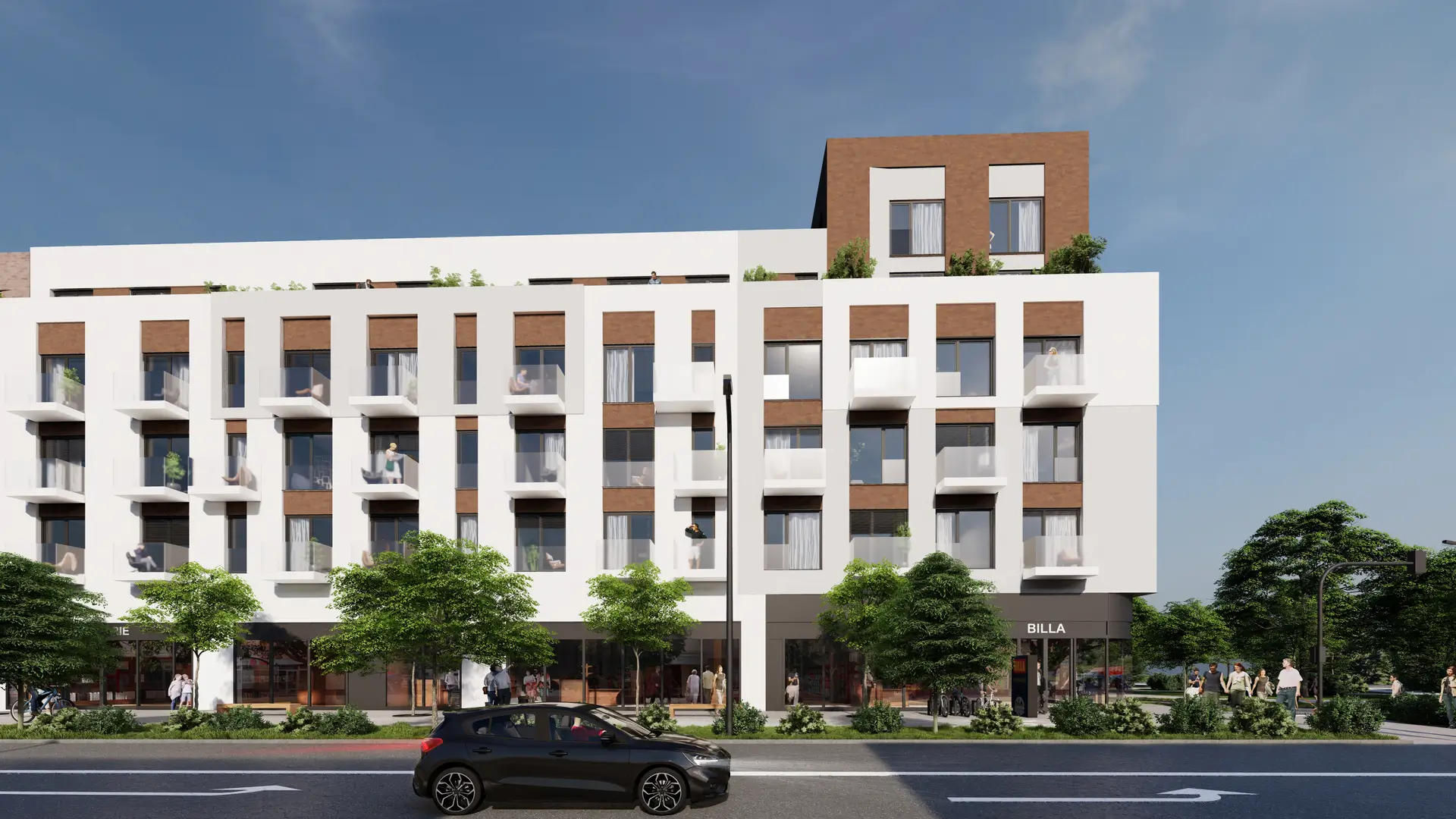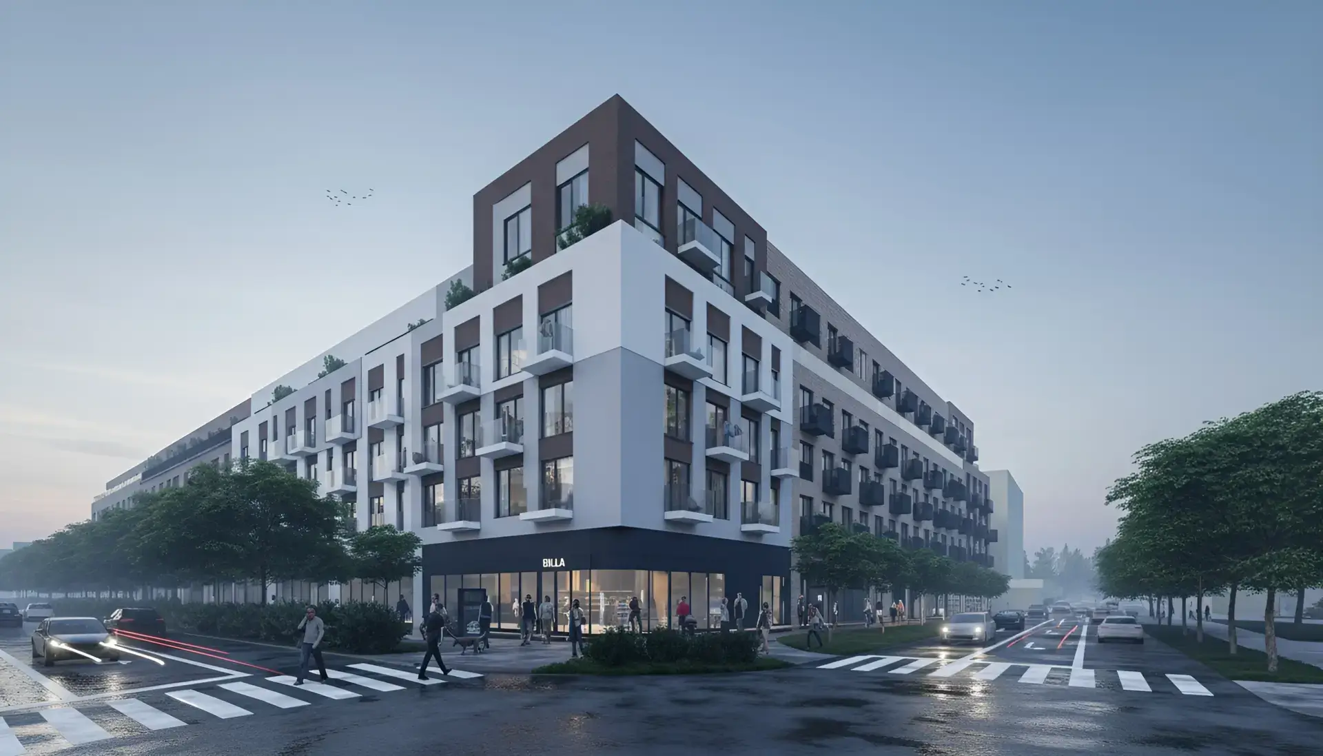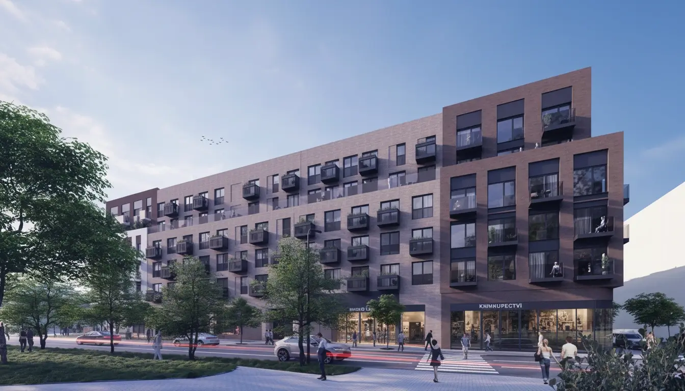 Obchody v přízemí, výsadba stromů a revitalizace blízkého okolí promění lokalitu v přirozenou součást městského centra.
